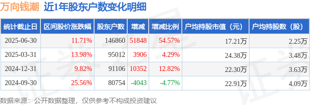 从股价来看,2025年3月31日至2025年6月30日,万向钱潮区间涨幅为11.71%,在此期间股东户数增加5.18万户,增幅为54.57%。